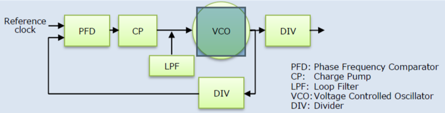 由石英晶体振荡器所产生的参考时脉讯号输入到PLL电路时,可以根据PLL电路分频器的分频比将时脉讯号调整到目标频率之后再输出,但抖动特性将会因为PLL电路的频率调整而恶化。透过找出是从PLL电路的哪个部分而导致抖动特性恶化的影响并加以对其进行改善,将可实现低抖动特性的开发目标”打破抖动特性和电流消耗之间的权衡” 。